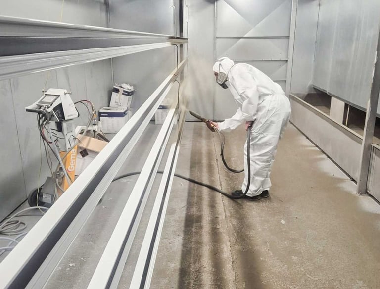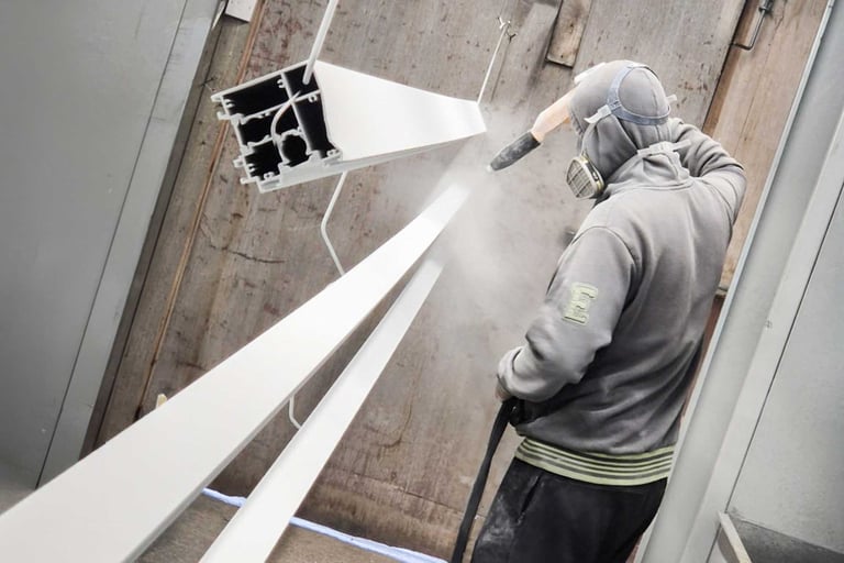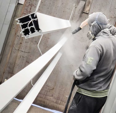 Aluminium powder coating for extrusions, frames and components, with full pre-treatment and capacity up to 7 m for a tough, even, long lasting finish.