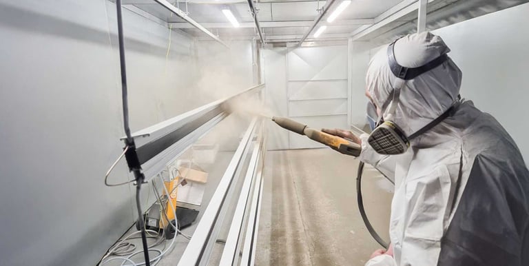 Aluminium powder coating for extrusions, frames and components, with full pre-treatment and capacity up to 7 m for a tough, even, long lasting finish.